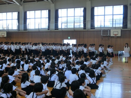 今日の2限目にメル先生とのお別れ会がありました。1年生は①「英語を教えていただきありがとうございました」②「とても楽しかったです」全員でThank you!2年生は①「英語の歌が楽しかったです」②「○○ゲームが楽しかったです」全員でI like Englishのように、学年毎に日本語と英語で感謝の気持ちを伝えました。メル先生はアメリカのシアトルに帰られた後、大学院で日本語の先生になるとおっしゃっていました。そして、日本の良さを広めたいともおっしゃっていました。メル先生、どうかお元気で。夢の実現に向けて頑張って下さい。ありがとうございました!