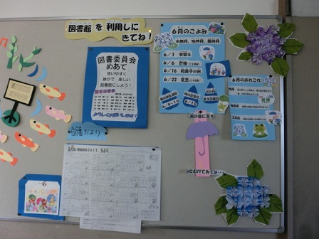 児童玄関の図書委員会スペースにも七夕飾りが登場しました。自由に願いごとが書けるようになっています。また、その横には、体育委員会がフリースロー大会を企画したようで、参加申し込み書が置かれています。楽しい企画です。学期末で、各学年とも勉強の追い込み?まとめを行う時期になりました。そんな中で、楽しい企画に参加するのもいいですね。
