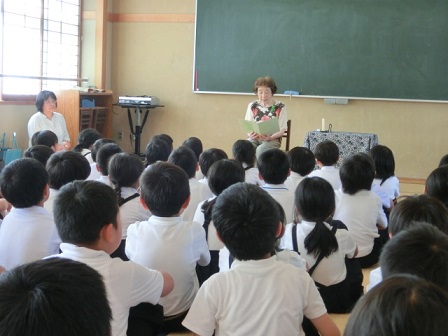 今日、1学期最後の「やまんばさんによるお話会」がありました。内容は、手遊び、詩(「あいうえ おはようもりのあさ」「トマト」)や絵本(「ポットくんとミミズくん」)の読み聞かせ等です。1年生の子どもたちは興味津々、とても楽しそうに聞き入っていました。