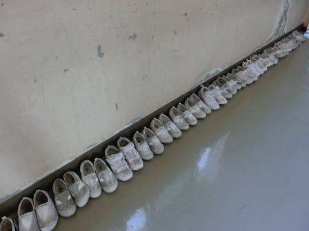 どの学年が和室を使っても、ズックをきれいに並べるのは、外小では当たり前。1年生もとてもきれいに並べることができました。入学以来、できることがたくさん増えました!