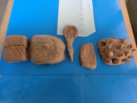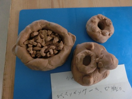 廊下のロッカーの上には、図工で作ったおいしそうなものがたくさん並んでいたので、思わず撮りました。
