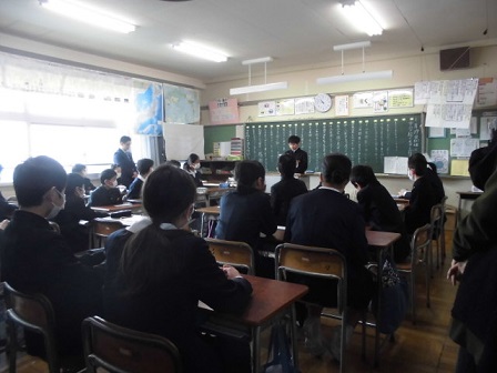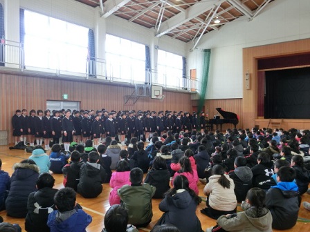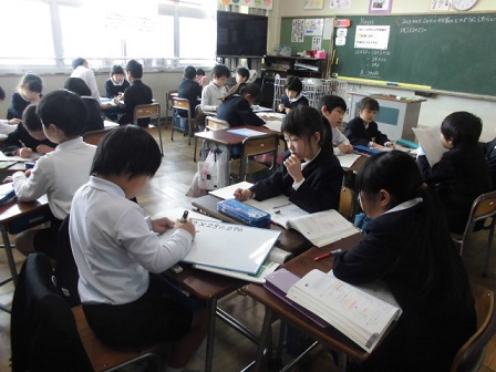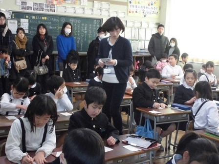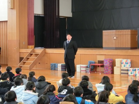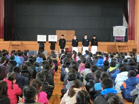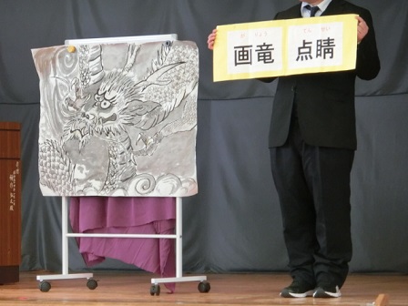 画竜点睛の故事(物事を立派に完成させるための、最後の仕上げ)を紹介し、「しっかり考える」「自分らしくチャレンジする」をキーワードに、2月・3月はまとめをしっかりして欲しいとのお話でした。(初めは竜に睛が入っていなかったのですが、途中でお話の絵師のように、校長先生が睛を描き入れたので、みんなはすごくし~んと見入っていました。天に舞い上がる?)
