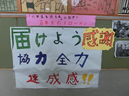 参観日が終わり、いよいよ今週から2月に突入です。5年生が6年生を送る会に向けて、地道に動きを進めています。6年生を送る会のスローガンは「ずっと大好き ありがとう 6年生への全力エール」です。なんと素敵なキャッチコピーでしょう。こんな言葉を言われたらうれしいでしょうね。6年生。