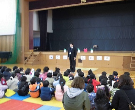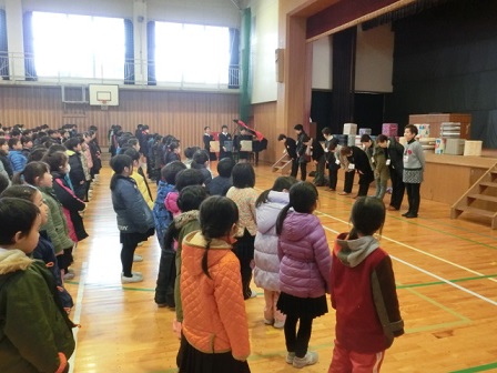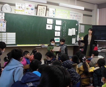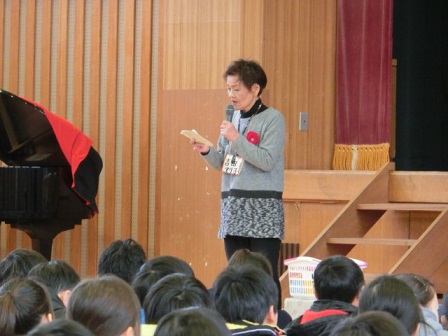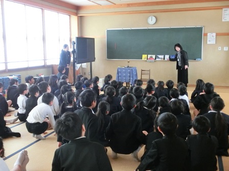 今日の4限目に、2年生のお話会がありました。お話サークルやまんばから細川さんが来て下さいました。手遊び(いちじくにんじんさんしょうホイ)や詩(ゆきがふる:まどみちお、かぜひきこぎつね:くどうなおこ)、絵本の読み聞かせ(「かえるをのんだととさん、ふしぎなたいこ)などがありました。とっても楽しい時間を過ごした2年生。3月の1年生で、今年度最終となります。