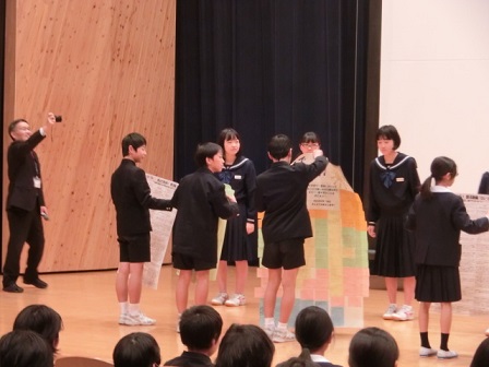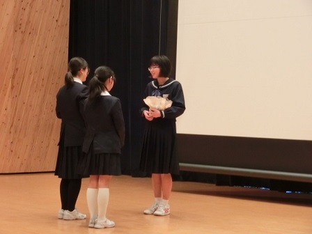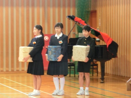 入学説明会の最後に、フジバカマと木津桃の贈呈式を行いました。2小学校と河北台中学校の連携のシンボルとなります。桃の花が咲く春、フジバカマが咲き誇る秋が楽しみですね。河中にもアサギマダラが舞うと・・・すてきですね!!