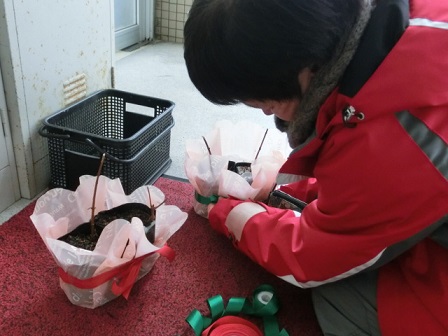 明日は、6年生の河北台中学校体験入学です。全員が中学校まで歩いて登校したり、授業を体験したり、入学に当たっての様々な説明を聞いたりします。その最後に、「フジバカマと木津桃」の贈呈式が行われます。これは河北台中からの要請で行われるもので、外日角小、七塚小の両校が地域を巻き込み積極的に取り組んでいるふるさと教育の題材「フジバカマと木津桃」を、中学校の生徒玄関前花壇に植え、小中連携のシンボルとするというものです。とても素敵な発想に賛同した2小学校。代表児童が、河北台中生徒会の皆さんに手渡します。