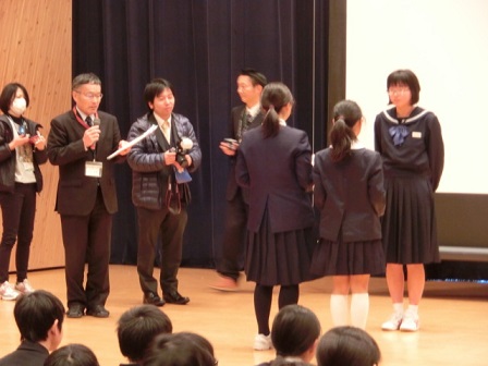 昨日の全校集会に先立ち、今朝の北国新聞でも紹介されていましたが、「思いやりのいす」の贈呈式が行われました。お忙しい中、9人のボランティアの方々に来て頂きました。コミスク学校コーディネーターの駒井先生が、名札を作ってくれました。子どもたちに名前を覚えてもらうことが、今後の挨拶運動にも繋がると考えたからです。とても意義のある会を行うことができてよかったです。