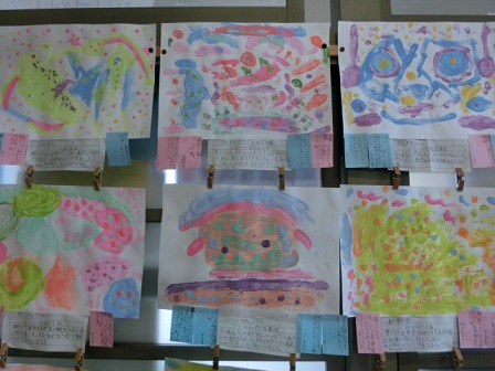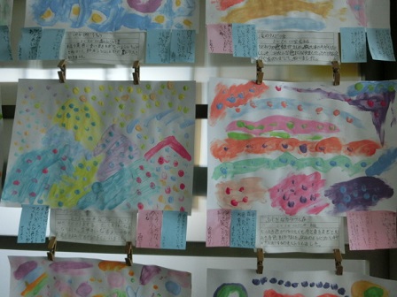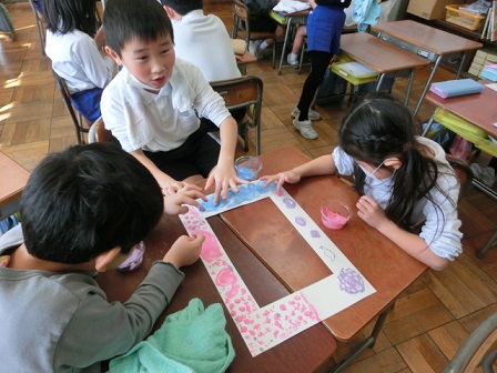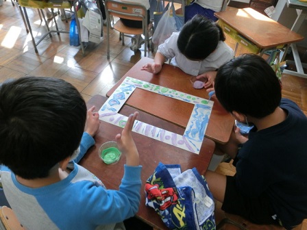 2年生は、図工の時間に絵の具遊びで、指を使ってぐるぐるしたり、点々にしたり、形を表したりして、いろんな世界を表現していました。そのやり方を使って額縁?を作っているようです。面白くてきれい、その上友達と手早くできて・・・とても素敵な作品(額縁)が出来上がりますね。