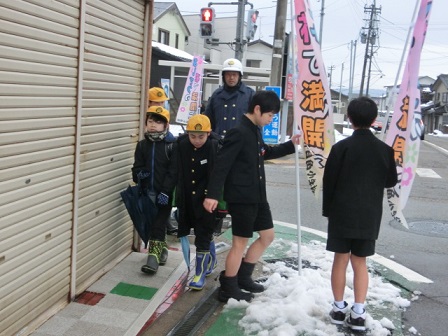 今朝、県道でトラックが車道をふさいでおり、迂回する車両や雪で危険と思われた場所に職員を配置しました。外日角小学校口の信号の所も、かなり狭くなっており複数の職員が立ちました。街頭指導当番で来て下さった保護者の方は、スコップで雪かきをしながら、子どもたちを横断歩道で渡して下さいました。本当に本当に有り難かったです!感謝です!