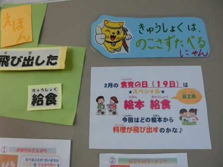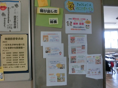毎月19日は食育の日。今日は今年度2回目の「絵本から飛び出す給食」の日でした。献立は「わかさぎのてんぷら・豚キムチラーメン・キャベツとわかめのナムル・ごはん・牛乳」でした。さて、飛び出したのは・・・。絵本「おばけのてんぷら」から「てんぷら」、絵本「じごくのラーメンや」から「ちのいけラーメン(豚キムチラーメン)」でした。とてもおいしく食べちゃいましたが、図書室前の紹介を読んでみると、おもしろそう。えんま様が天国なんかに負けないぞと言っています。どんなお話なのか、図書室で読んでみるといいですね。ぜひ家庭での話題の一つに!