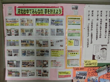 河北台中の校長先生が、お忙しい中、2月2日に行われた河北台中での体験入学のときに使ったプレゼン画面を掲示物にして持ってきて下さいました。フジバカマの贈呈式や外小での英語や数学の体験授業の新聞記事が貼ってあったり、アナログにビニールテープが貼ってあったりします。「河北台中でみんなの夢を叶えよう」というタイトルが心に響きます。各担任がクラスで校長先生の思いを伝えた後、6年掲示板に飾ったようです。待っていてくれるってうれしいですね!