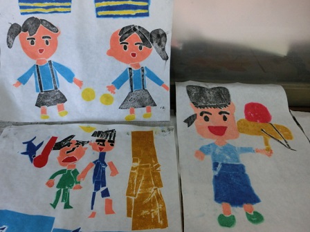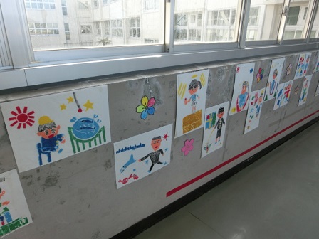 1年教室の横のロッカーの上に、6年生を送る会のときの飾りに使う紙版画がありました。学校生活の様子を表現したようです。図工の時間に作った物です。とてもカラフルできれいです。6年生が通る本校の歴史を感じる?古い?体育館通路が、とても温かく素敵になりますね。