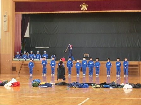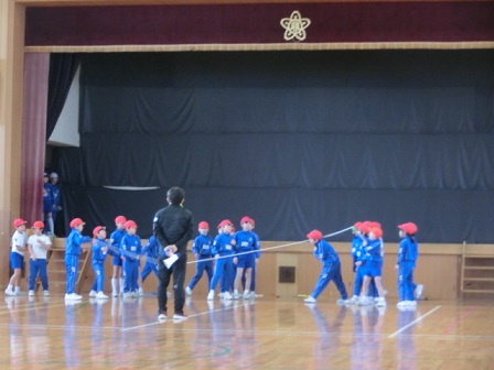 1年生のおむすびころりん。年長さんに見せた劇を更にパワーアップして披露しました。穴の中でおじいさんを楽しませたコマやけん玉、フラフープ、まりつき等とても上手でした。大縄を使ってのあやとり。何ができるのだろうと見ていると・・・。「東京タワー!」の声で思わずみんな笑顔に!!とてもかわいくて上手でした。