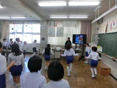 1年生の教室では、昔遊びでお世話になって、できるようになったことを紹介してお礼を伝えていました。