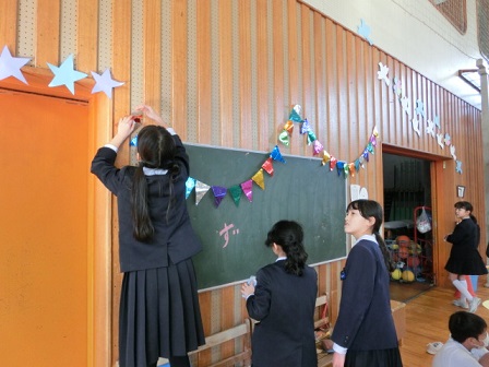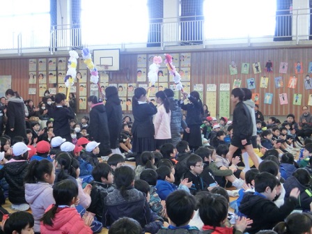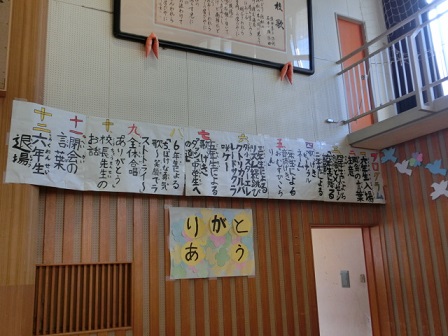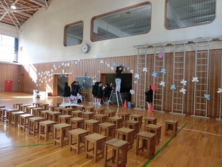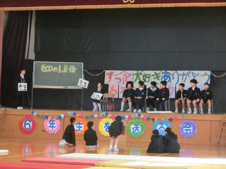 今日の2~3限に6年生を送る会が開かれました。この日のためにたくさん練習をしてきた在校生、5年生のリードで体育館の飾りなどが整い、いよいよ本番となりました。