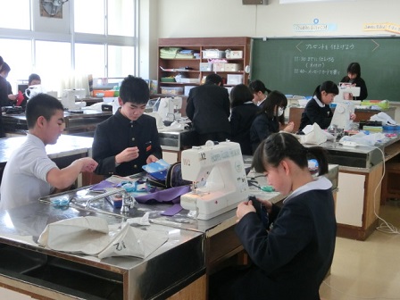6年生が家庭科の時間にプレゼントを作っていました。お世話になった先生方へのプレゼントだそうです。各クラスで何を作るか話し合ったそうです。どれも工夫があり、何より心がこもっていて素敵な作品ばかりでした!