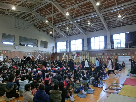 1年生のおむすびころりん。年長さんに見せた劇を更にパワーアップして披露しました。穴の中でおじいさんを楽しませたコマやけん玉、フラフープ、まりつき等とても上手でした。大縄を使ってのあやとり。何ができるのだろうと見ていると・・・。「東京タワー!」の声で思わずみんな笑顔に!!とてもかわいくて上手でした。