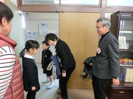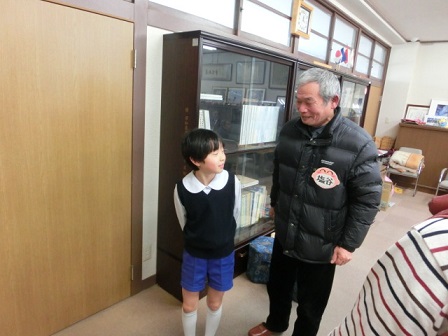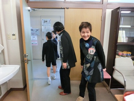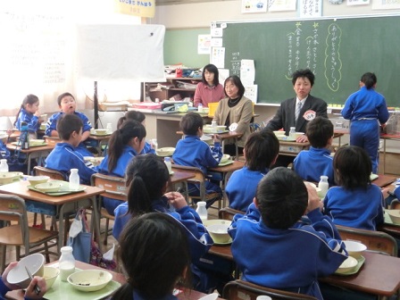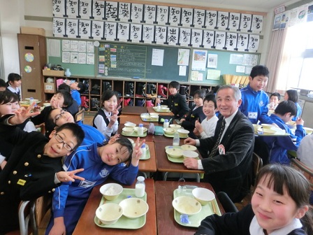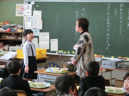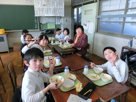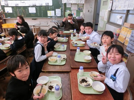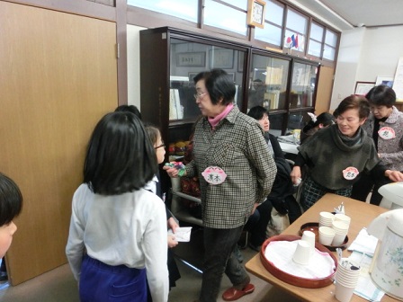 昨年に引き続き、今日に合わせて、ボランティアさんを給食に招く「ありがとうの給食」が行われました。1~4年生の各クラスの案内役の児童が、給食準備ができたら校長室に来ます。