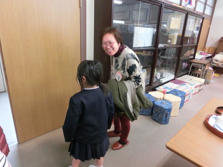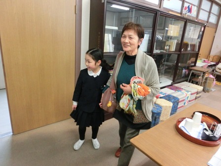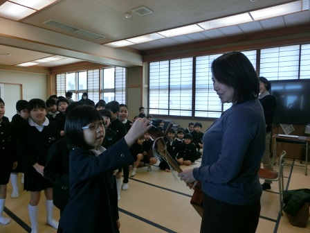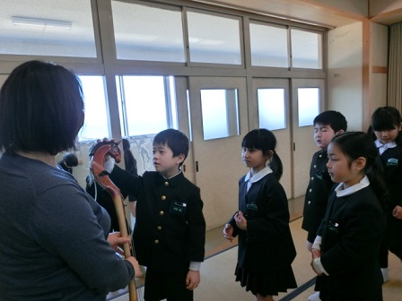 1年生の教室では、昔遊びでお世話になって、できるようになったことを紹介してお礼を伝えていました。