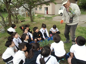 2年生が総合の学習の時間にこれから育てる野菜の苗を植えました。畑のお世話をして下さっている地域ボランティアの方が丁寧に苗の植え方を教えて下さいました。畑の他にも多くの方々が学校に関わり支えて頂いています。