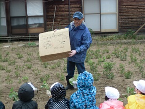 小雨の降る中、1年生がサツマイモの苗を植えました。