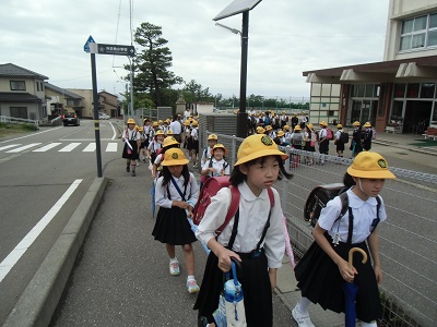 自然災害や犯罪から子ども達を守ることを目的に、集団下校訓練を行いました。最初は、下校班ごとに決められた教室に集合し、高学年リーダーが人数を確認しました。また、下校時の注意点や地域の方々へのあいさつの仕方を話しました。その後、遠い地域の班から下校を行いました。最近は、市内でもクマやサル等の野生動物が目撃されるなど、本校でも集団下校を行わなければならない事態が想定されます。そのような折りは、地域の方々の見守り、協力を是非にお願いいたします。