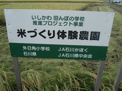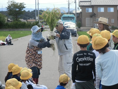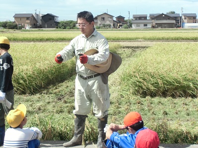 台風が近づき蒸し暑い天候でしたが、何とか予定していた稲刈り体験を行うことが出来ました。 田んぼは5月に植えた稲が、ずっしり頭を垂れ、黄金色に輝いていました。