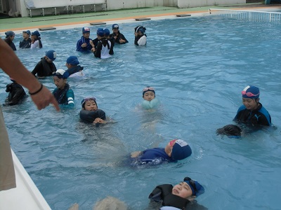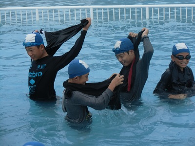 毎年、水泳指導の最後に2、4、6年生は着衣泳を行っています。