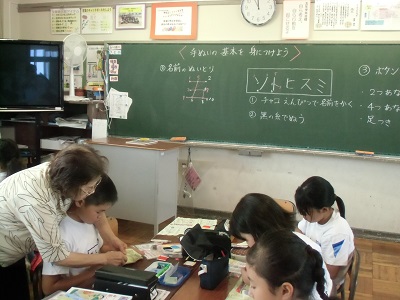 5年生の家庭科の時間に5名の裁縫の先生に来ていただき、手縫いの基本を習いました。