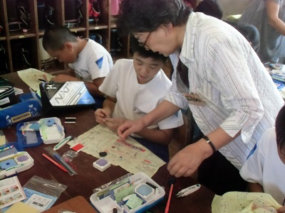 今日は、城村先生に来ていただき、濃く書くためのポイントや、形で注意することなど教わりました。みんなお手本を見ながら集中して練習することができました。