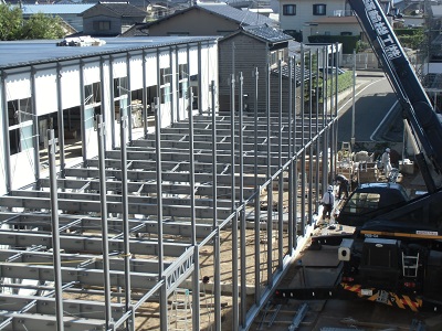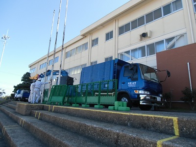 昨日、運動会の本部テントがあった場所に、早速、工事車両が入り、仮設玄関の工事が始まりました。運動会の延期で、待ってもらっていたので、急ピッチで行われています。