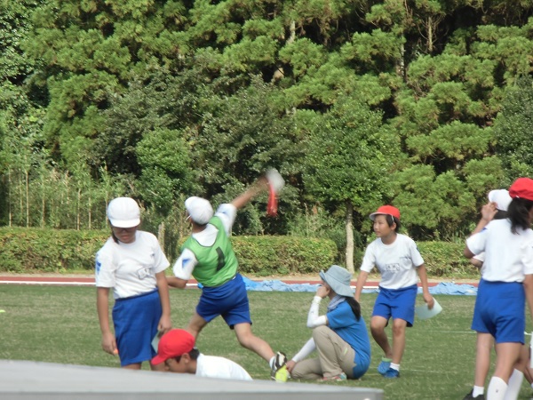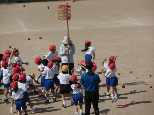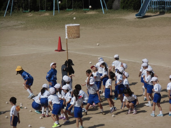 1年生がマラソン練習の後、運動会で出来なかった玉入れを行いました。