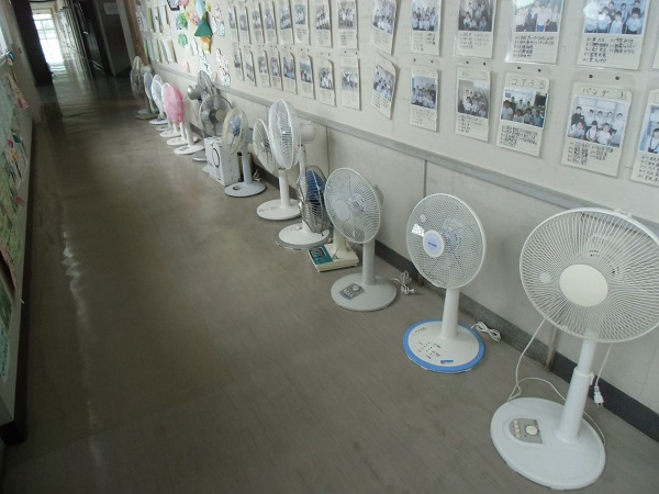 7月にお借りした扇風機をお返しするために、職員室前に並べてあります。