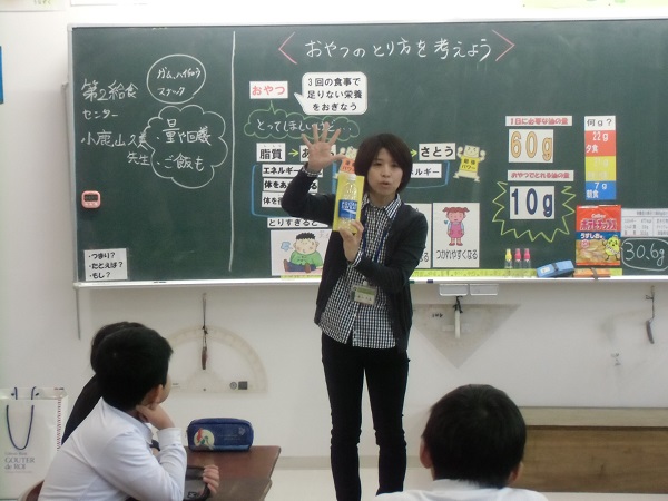 4年生が「おやつのとりかたを考えよう」という課題で栄養教諭の小鹿山さんからお話を聞きました。
