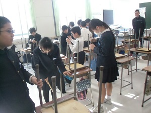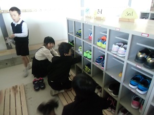 自分の下駄箱をきれいに掃除していました | イスの足にこびりついた汚れもそぎ落としました | 全校集会で4年生が群読を行いました |