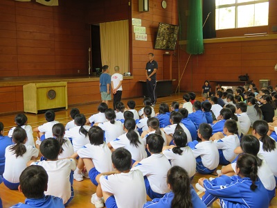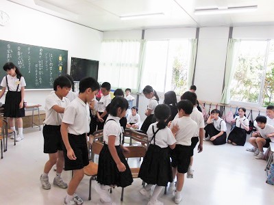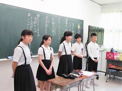 朝の集いでは、互いの学校の良いところを紹介たりミニレクレーションとしてジャンケ列車や自己紹介ゲームをしました。