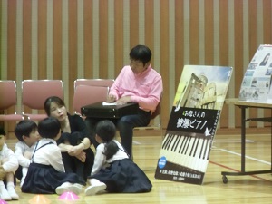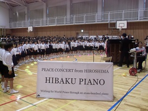 絵本「ミサコのピアノ」の朗読、代表児童による被爆ピアノの演奏、児童伴奏による全体合唱等、
