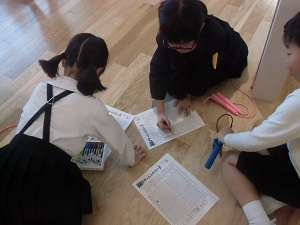 友達同士、跳んだ回数を数え合いながら縄跳びカードに記録しています。
