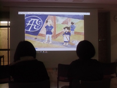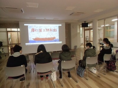 完成した唐仁屋三郎兵衛の紙芝居DVD化に向け、図書ボランティアさんががんばっています。