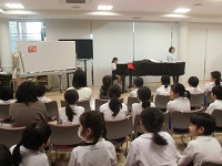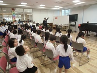 昼休み、演奏場所の多目的ホールには多くのお友達が集まり演奏を聴きました。