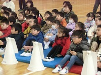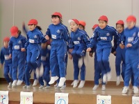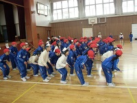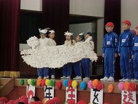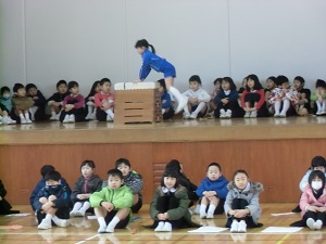 最初は体育館で全体合唱や、縄跳びコマ回しなどの得意技紹介、「くじらぐも」の音読劇を披露しました。
