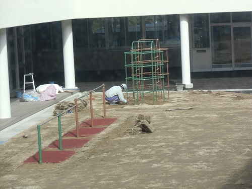 今日は中庭の遊具が設置されました。低学年の遊び場となる予定です。
