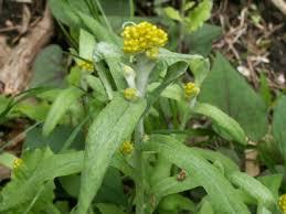 道端や畑などに見られる小型の草で、全体が白い綿毛に包まれていて白っぽく見え、葉は細いへら形で、春から初夏に細かい黄色い花を密に咲かせます。