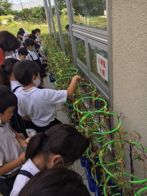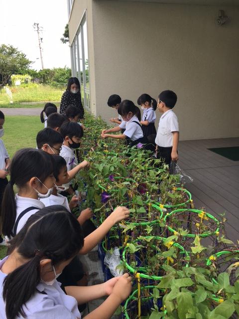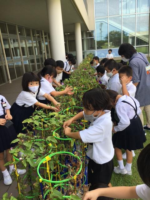 今日の生活科の時間に、1年生がアサガオの種を収穫しました。