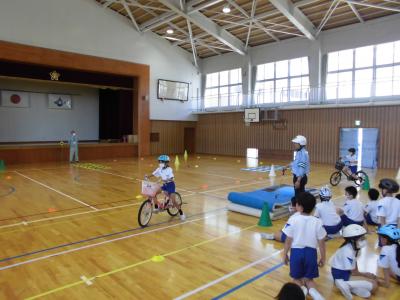 体育館で自転車に乗り、気を付ける点を教えていただきました。