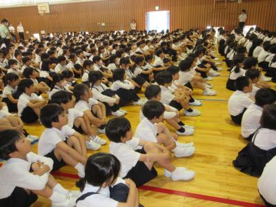 昨年度も行われていなかったようですが、今年度初めて、体育館に集まって全校集会を行いました。