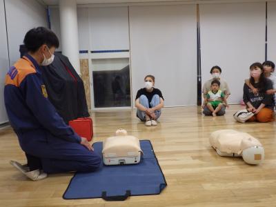 かほく市消防本部の2名の職員をお招きし、心肺蘇生法やAEDの使用法を実践しました。