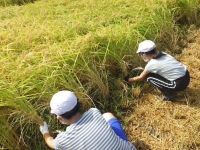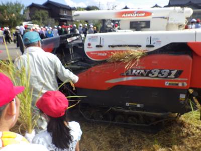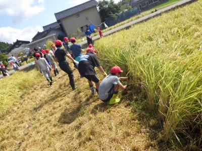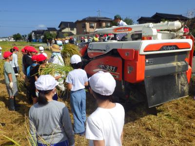 5年生が田植え体験に続き、稲刈り体験を行いました。1人3株を刈り取るという短い体験でしたが、楽しんでいたようです。刈り取った稲はコンバインを使ってすぐに脱穀し、その様子も見せていただきました。貴重な体験ができました。