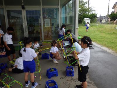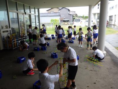 1年生が朝顔のつるを使ってリースづくりをしました。