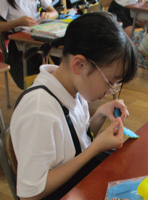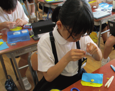 5年生の家庭科の授業で、裁縫で小物づくりを行っています。玉止めや玉結び、なみぬいなどを練習し、布を縫ったりボタンを付けたりしました。刺繍にチャレンジしている子もいます。裁縫スキルをしっかり身に付け、自分の生活に生かせるようにしたいですね。